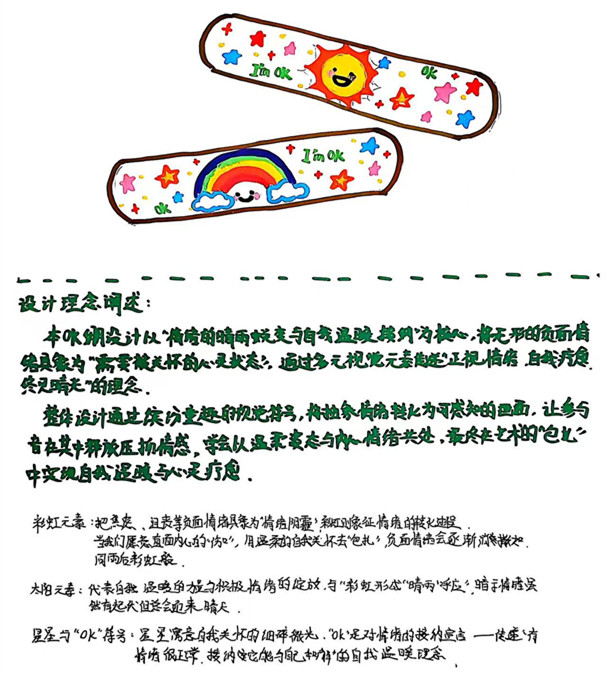 方寸OK绷,恰似情绪的“温柔胶片”。或以游鱼穿梭的意象,勾勒自我调节的从容;或以音符跃动的韵律,诉说情绪的共鸣;每一笔设计,都是自我与内心的温柔对话;每一款作品,都是从“看见情绪褶皱”到“温柔抚平伤痕”的自我焕新。活动鼓励参与者将无形情绪化为有形设计,在绘画中完成自我对话。