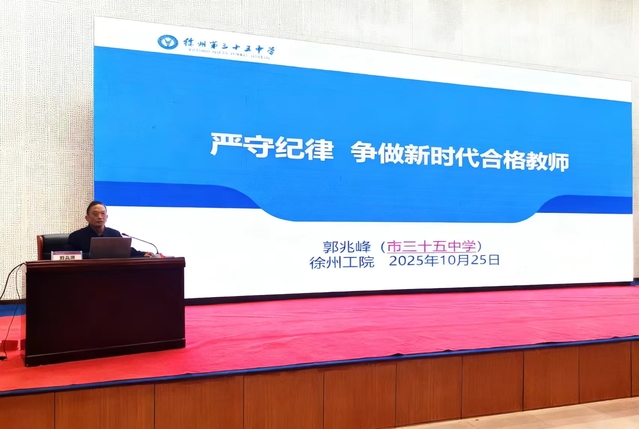 徐州市三十五中学校长郭兆峰为新教师们讲授了《严守纪律—争做新时代合格教师》的专题。郭兆峰校长结合学校发展定位与教师队伍建设要求,开宗明义强调纪律建设对教师职业发展的核心意义。他指出,新时代教师肩负“为党育人、为国育才”的重要使命,纪律是践行育人使命的根本前提,既是规范教学行为的“高压线”,也是守护职业成长的“护身符”,新教师必须从入职之初就树立牢固的纪律意识。授课中,郭校长围绕三大核心展开:一是剖析“纪律为何重要”,结合教育领域典型案例,阐明纪律松弛对教学质量、学生成长及学校声誉的负面影响;二是明确“纪律守哪些”,系统解读《新时代中小学教师职业行为十项准则》及学校考勤、备课、师德等内部管理细则,聚焦课堂教学、师生交往、家校沟通等关键场景的纪律要求;三是指导“纪律如何践行”,提出“敬畏心、责任心、自律心”的“三心”践行路径,鼓励新教师从备课授课、日常考勤等小事做起,将纪律要求内化于心、外化于行。