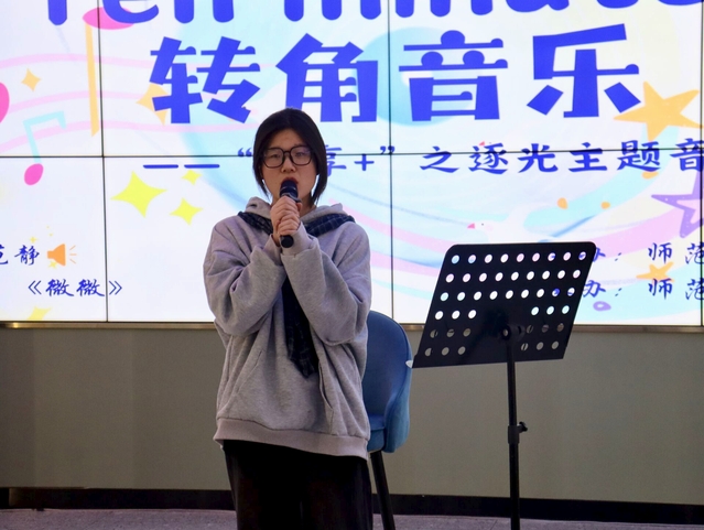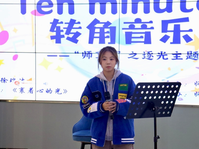 1121日晚,校园灯光如昼,师范学院如期开展第二十九期“Ten minute转角音乐”活动。本期以“逐光”为主题,徐瑞洁、范静、冯楚涵三位同学轮番献唱,《裹着心的光》、《微微》、《落在生命里的光》串联成一条“追光”长廊,歌声或温暖或坚定,引来掌声如潮。现场300余名师生在微光里同频共振,于旋律中汲取前行力量。今后将持续用音乐点亮校园,让逐光故事声声不息。