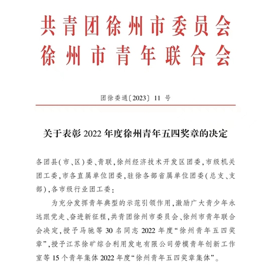 徐州青年五四奖章是共青团徐州市委员会、徐州市青年联合会授予优秀青年的最高荣誉,旨在树立政治进步、品德高尚、贡献突出的优秀青年典型,激励全市广大青年积极投身中国式现代化徐州新实践。据悉,此次共授予30名同志徐州青年五四奖章
