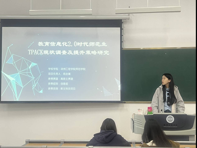 徐州工程学院师范学院于2024年10月23日19时在求真203举办学院挑战杯选拔赛。比赛选手从选题、研究方法、数据分析、论文撰写等方面,进行现场展示。学院组织院内评审,对作品及作者资格审查,对申报作品充分评估,最终遴选出4组项目晋级。