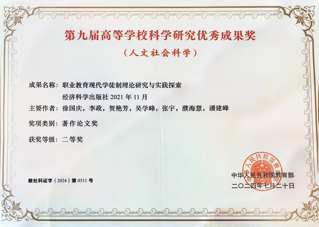 日前,教育部社会科学司公布了第九届高等学校科学研究优秀成果奖(人文社会科学)评选结果。我院吴学峰副教授的独著《职业教育现代学徒制的制度构建》作为2015年度教育部哲学社会科学研究重大课题攻关项目“职业教育现代学徒制理论研究与实践探索”成果之一,荣获二等奖,排名第四。